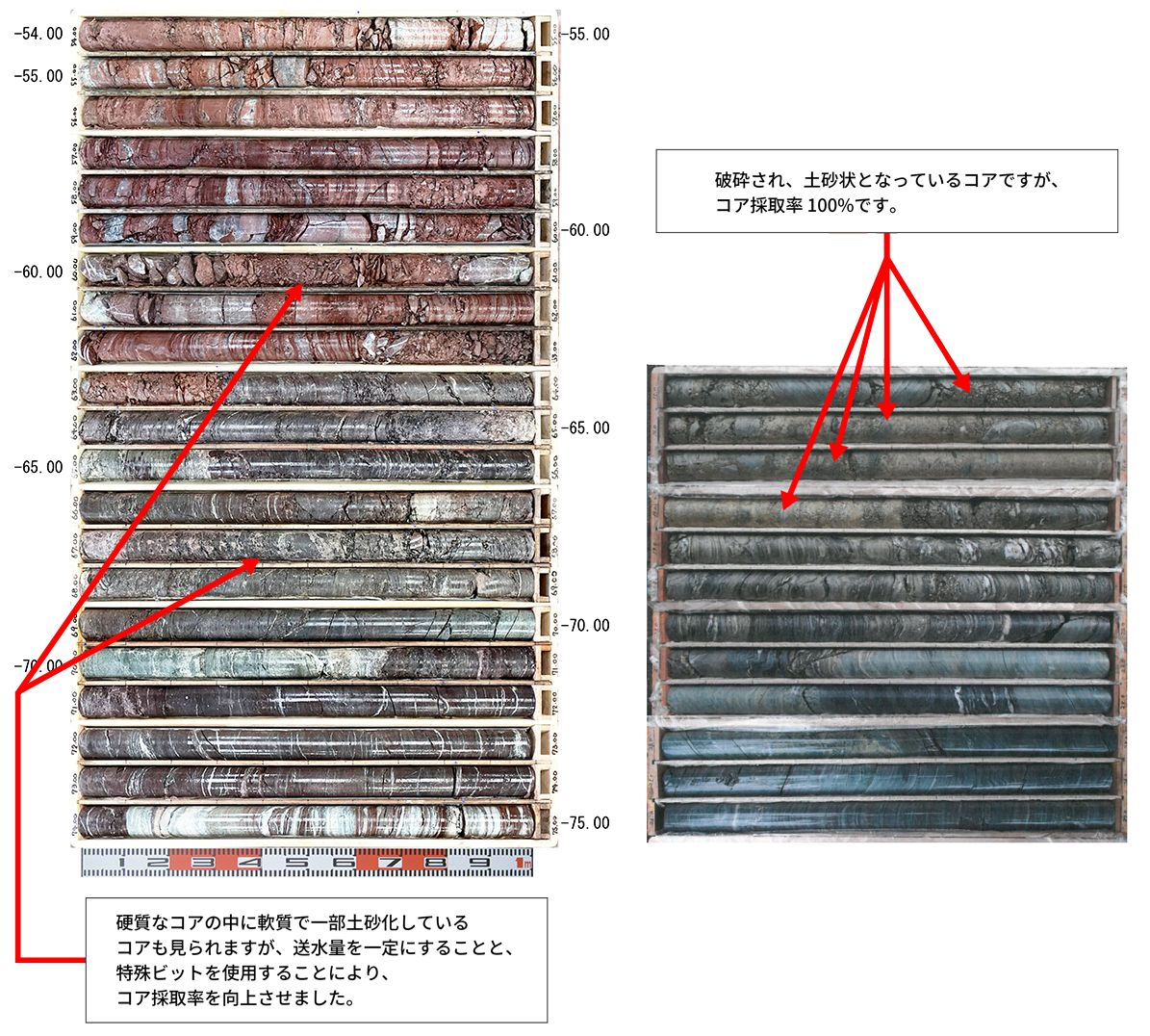 ボーリングコアを採取する技術は、各社が工夫していますが、当社においても数々の工夫を行っています。